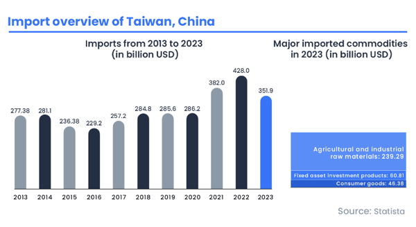 The economy is heavily trade-oriented. In 2023, merchandise exports represented around 60% of total GDP, while the trade surplus reached US$80.6 billion, ranking among the highest globally. Limited natural resources mean raw materials must be largely imported, with agricultural and industrial goods forming the main import categories. Owing to its geographical proximity and long-standing commercial ties, mainland China remains the largest trading partner for both imports and exports.