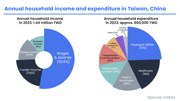 In 2023, average annual household income was approximately TWD 1.44 million, with wages accounting for 52.6%. Housing services and utilities such as water, electricity, and gas represented the largest share of household spending at 24%.