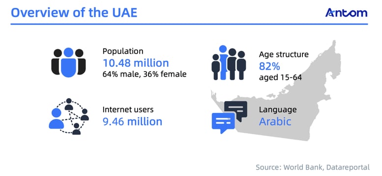 The United Arab Emirates (UAE) has a population of 10.48 million, with males making up 64% of the total. The country has a notably youthful population, with 82% aged between 15 and 64, driving strong consumer growth. The official language is Arabic.