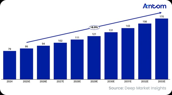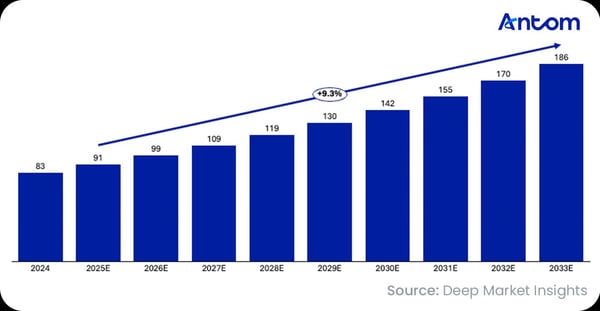 Europe’s online education market size and forecast (in billion USD), 2024– 2033