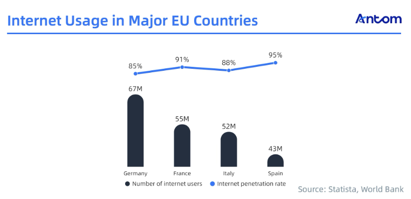 Digitalisation is particularly high in the major EU economies, with France and Spain exceeding 90% Internet penetration. Germany leads with 67 million Internet users, contributing to a vast digital market of over 217 million users.