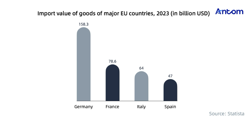 The EU’s biggest economies are also major players in global trade. Germany’s imports totalled USD 158.3 billion in 2023, solidifying its status as the EU's largest economy. Other major EU economies, like France, have smaller import volumes but show strong consumption momentum, reflecting high demand for imported goods and a significant customer base for cross-border e-commerce.