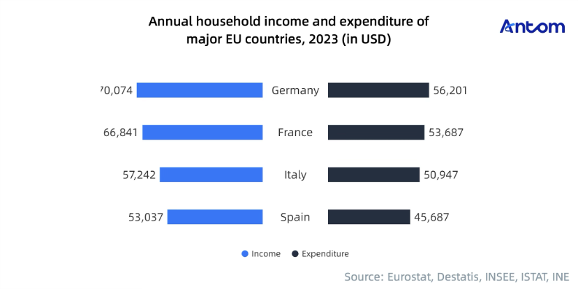 Italy and Spain have slightly lower incomes than Germany and France but still remain high. Household expenditures in major EU economies surpass 80% of their income, with Italy nearing 90%. This high-income spending pattern indicates strong purchasing power and elevated consumer expectations for quality and service, creating favourable conditions for premium products in the EU market.