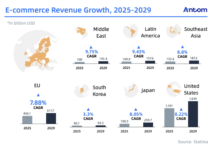 E-commerce is gaining strong momentum in the EU as consumers actively shop online for both affordable and luxury goods. Statista forecasts that from 2025 to 2029, the EU e-commerce market will grow from US$456.1 billion to US$617.7 billion, with a CAGR of 7.88%.