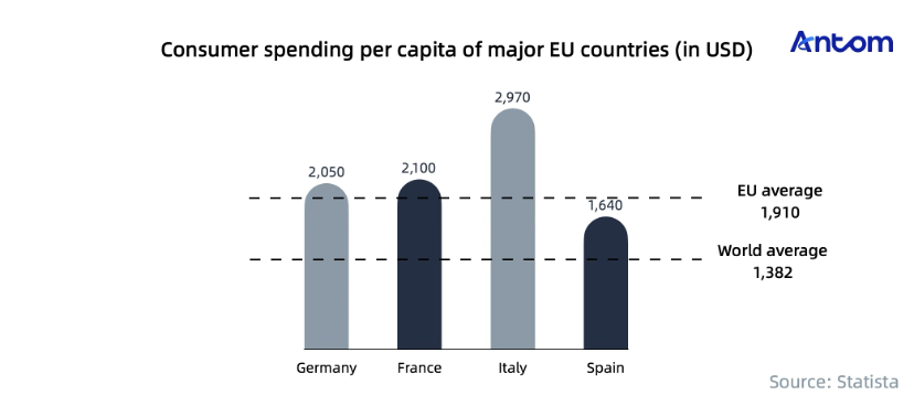 EU consumers show strong purchasing power, with per-capita e-commerce spending far above global averages. For example, in 2023, Italy's per capita e-commerce spending reached US$2,970. This was significantly higher than the global average of US$1,380, showing consumers’ demand for quality goods and shopping experiences.
