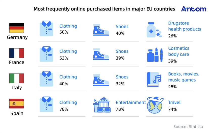 Clothing leads online purchases among these countries, particularly in Spain, where 78% of consumers buy apparel. Spanish shoppers also prefer leisure and entertainment products at a rate of 78%. Each country has unique third-preference categories: Germany favours health products (26%), France prefers beauty products (39%), Italy selects books and media (28%), and Spain chooses travel products (74%).