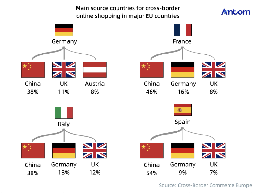 China is the main source of cross-border goods for major EU economies, with over one-third of consumers in all four countries buying from Chinese sellers. Spanish consumers lead with 54% purchasing from Chinese merchants, followed by France at 46%. Major Chinese platforms in the EU market include AliExpress, Temu, SHEIN, and TikTok, with Temu ranking as the fourth-largest platform in Germany during Q4 2023 and Q1 2024. Overall, cross-border shopping rates in major EU economies are much lower than domestic rates, indicating strong growth potential for Chinese merchants in the EU market.