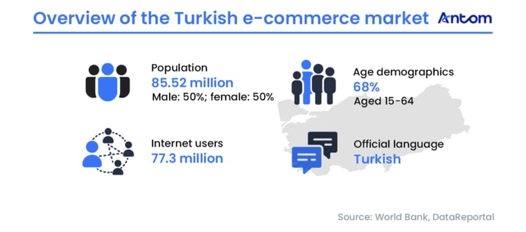 In 2024, Turkey’s total population reached approximately 85.52 million, with 77.30 million internet users. The gender distribution is balanced, and 68% of the population falls within the working-age bracket of 15 to 64. The official language is Turkish.