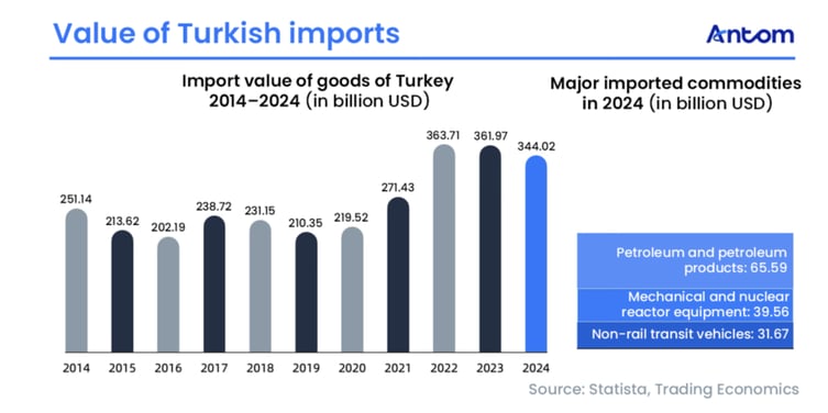 In 2024, Turkey’s merchandise imports reached $344.02 billion, with petroleum and petroleum products making up the largest share.