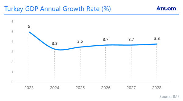Turkey, the 16th largest economy globally and 7th largest in Europe, has a BB- sovereign credit rating from S&P. Its GDP in 2024 was approximately EUR 1.2 trillion (USD 1.3 trillion). IMF estimates that GDP growth will slow from 5.0% in 2023 to 3.3%, with an expected 3.5% in 2025. The GDP scale continued to grow, but the growth rate slowed down compared to 2023.