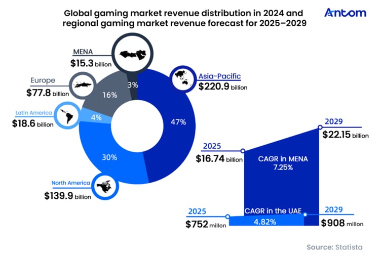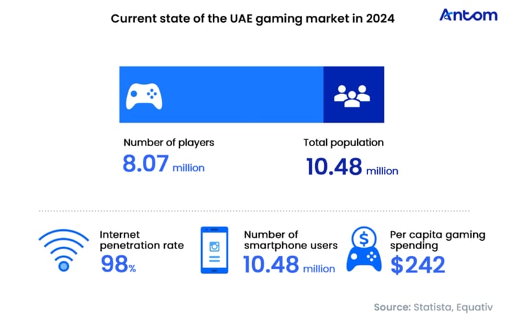 In recent years, the number of gamers in the UAE has been rising steadily, reaching 8.07 million in 2024 – equivalent to 77% of the total population. With an internet penetration rate of 98% and almost universal smartphone ownership, the UAE offers a strong digital foundation for the expansion of mobile gaming. At the same time, UAE players demonstrate strong purchasing power, with average gaming expenditure per person reaching USD 242 in 2024, well above the Middle East and North Africa (MENA) region’s average of $102.4.