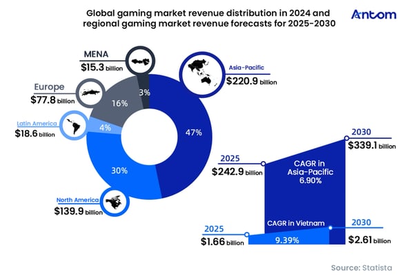 The Vietnamese gaming market is projected to achieve a CAGR of 9.39% between 2025 and 2030 – well above the Asia–Pacific average of 6.90%. This strong performance underscores Vietnam’s transformation from a developing market into a key growth engine within the global gaming industry.