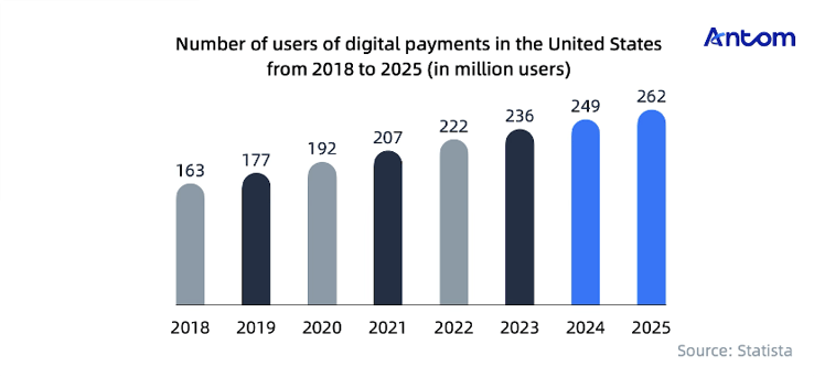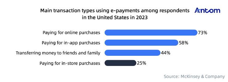 In 2023, digital payment penetration in the US reached 69.29%, with transaction value exceeding $2.12 trillion — the second-highest globally after China, and ahead of India. A survey revealed that US consumers mainly use digital payments for online shopping, in-app purchases, and transferring money to friends and family.