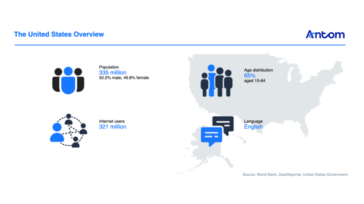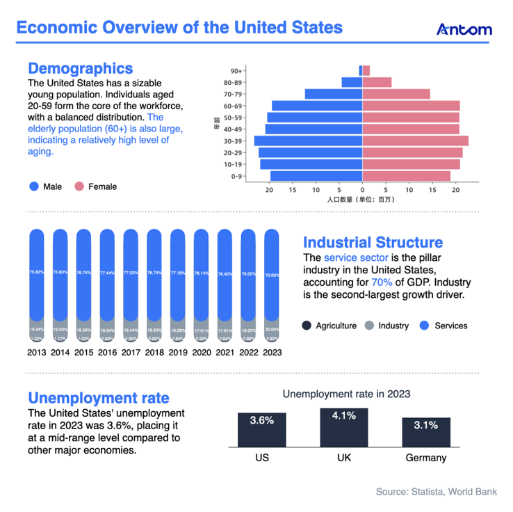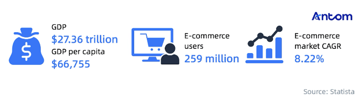 With a population of over 335 million and a GDP of US$27.36 trillion in 2023, the United States is the largest developed economy in the world. It has a strong labour force, low unemployment (at 3.6%), and a post-industrial economy where the service sector accounts for 70% of GDP. These fundamentals support the scale and resilience of its retail and e-commerce sectors.