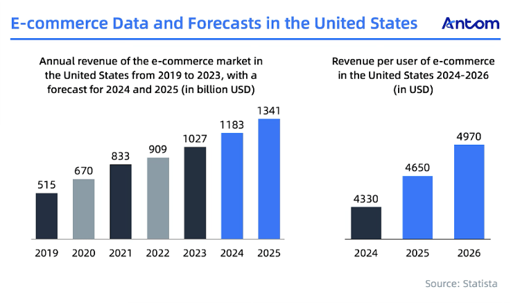 In 2023, US e-commerce had 259 million users and an 81.3% penetration rate, ranking first globally. By 2029, this user base is expected to grow to 334 million, with a penetration rate exceeding 97.1%. While growth has stabilised after the pandemic boom, the market remains dynamic: annual e-commerce revenues are expected to increase from US$1.03 trillion in 2023 to US$1.34 trillion by 2025.