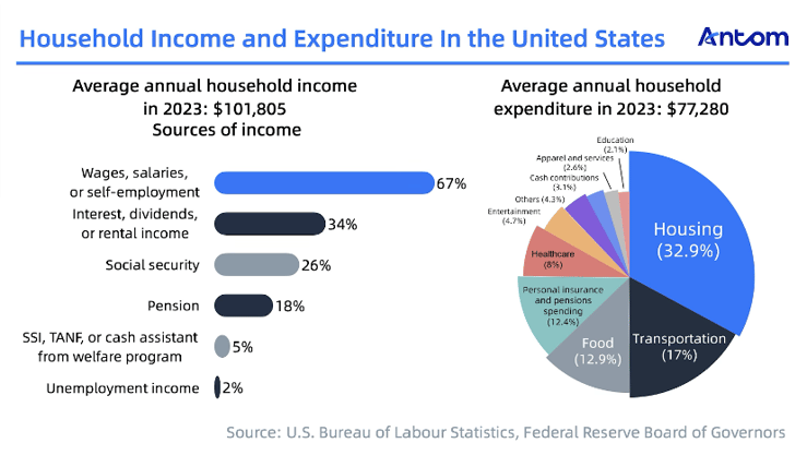 In 2023, the average U.S. household income was US$101,805, although the median was US$80,610. Essential expenditures such as housing, transportation, and food dominate spending, alongside robust savings and insurance awareness, with a significant portion dedicated to personal insurance and retirement contributions.