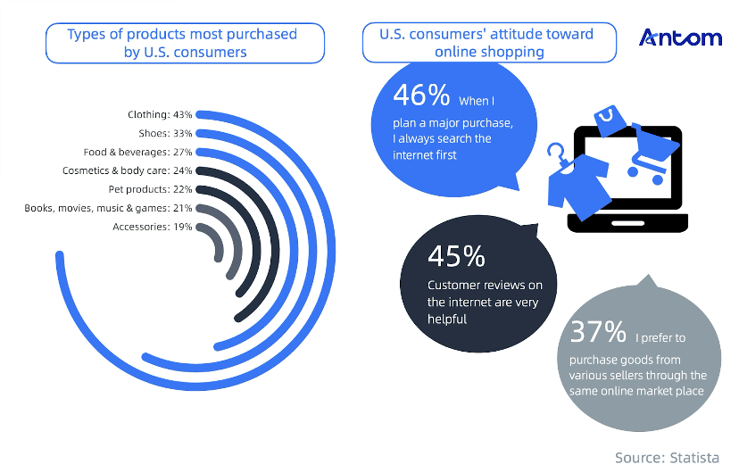 US consumers frequently purchase clothing, shoes, food and beverages, and beauty products online. For millennials, online purchases of children’s products, jewellery, and hobby items surpass in-store buying by over three times.